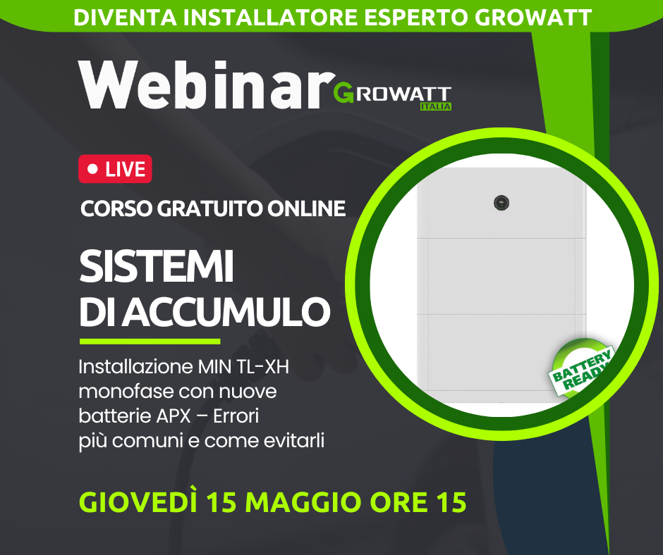 Caratteristiche, modalità di installazione, setting e monitoraggio, importanti aggiornamenti, risoluzione degli errori più comuni… nel corso dei webinar potrai approfondire conoscenze e tecniche installative dei prodotti GROWATT per diventare installatore qualificato.